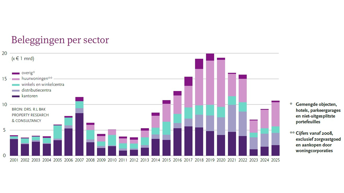 Uit de data blijkt dat vorig jaar in totaal voor € 10,7 mrd is belegd in Nederlands vastgoed. Dat is ruim 17% meer dan in 2024. Die stijging is een stuk minder spectaculair dan in het ‘terugveerjaar’ 2024, toen de plus uitkwam op liefst 30%, maar dat was dan ook een herstel van de enorme post-coronadip waar 2023 last van had. De markt leverde toen meer dan de helft aan transactievolume in. De grootste groei in 2025 laat de categorie ‘overig’ zien, met een 50% hoger beleggingsvolume tot € 0,28 mrd. De beleggingen in kantoren en winkels zijn met 15% toegenomen tot respectievelijk € 2,0 mrd en € 1,3 mrd, terwijl logistiek achterblijft met een min van een kleine 4% (€ 2,4 mrd).
