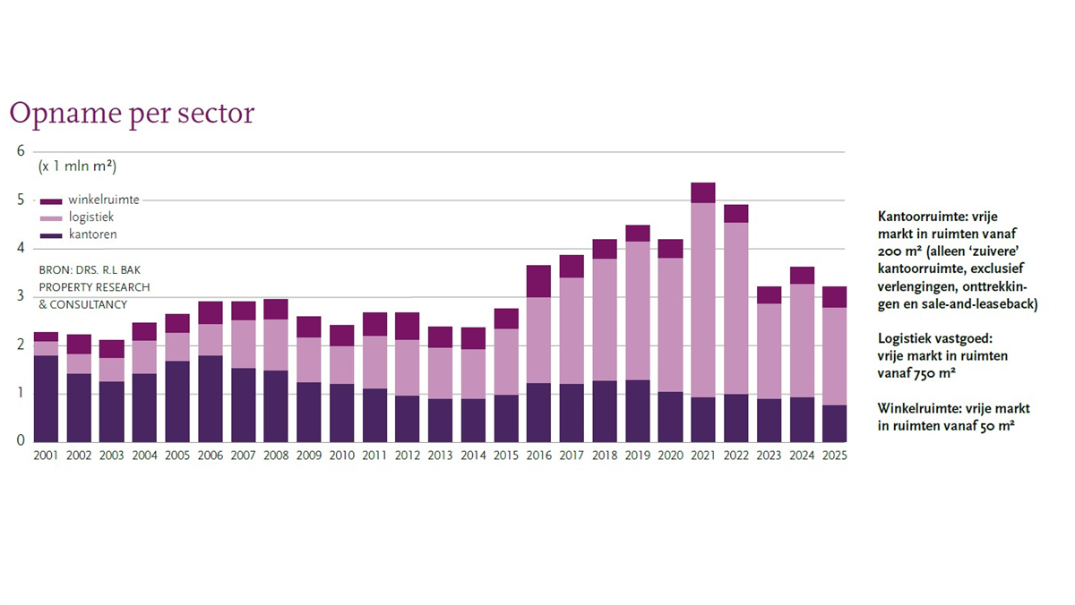 De opname van bedrijfsmatig vastgoed is in 2025 met 12% ingezakt tot zo’n 3,2 mln m². Alleen in winkelruimtes is een plus te zien. In de kantorenmarkt gaat het verhuurde metrage het meest naar beneden – met de kanttekening dat verlengingen, onttrekkingen en sale-and-leaseback niet worden meegeteld.