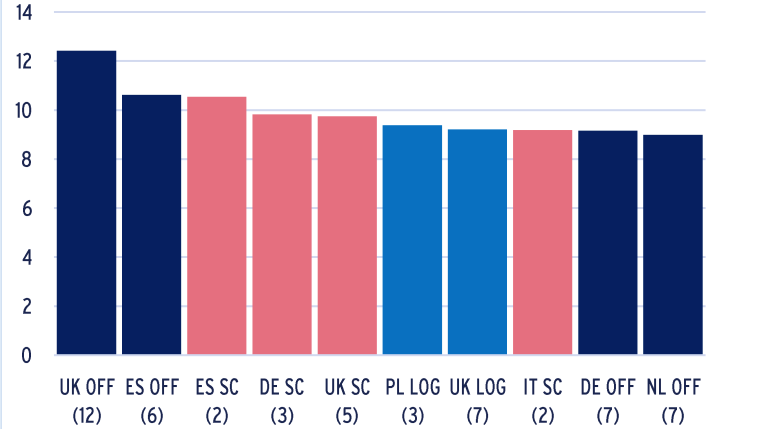 Onderverdeeld naar segmenten en landen is logischerwijs de Britse kantorenmarkt het best presterende onderdeel, met een verwacht jaarrendement van 12,4%. De Nederlandse kantorenmarkt staat nog net in de top 10 met een verwacht rendement van 9%. De markt voor winkelcentra in Spanje, Duitsland en het VK ziet er ook goed uit, met rendementen van tegen de 10% of meer. Op logistiek gebied denkt AEW aan Polen en het VK als koplopers met rendementen van meer dan 9%.