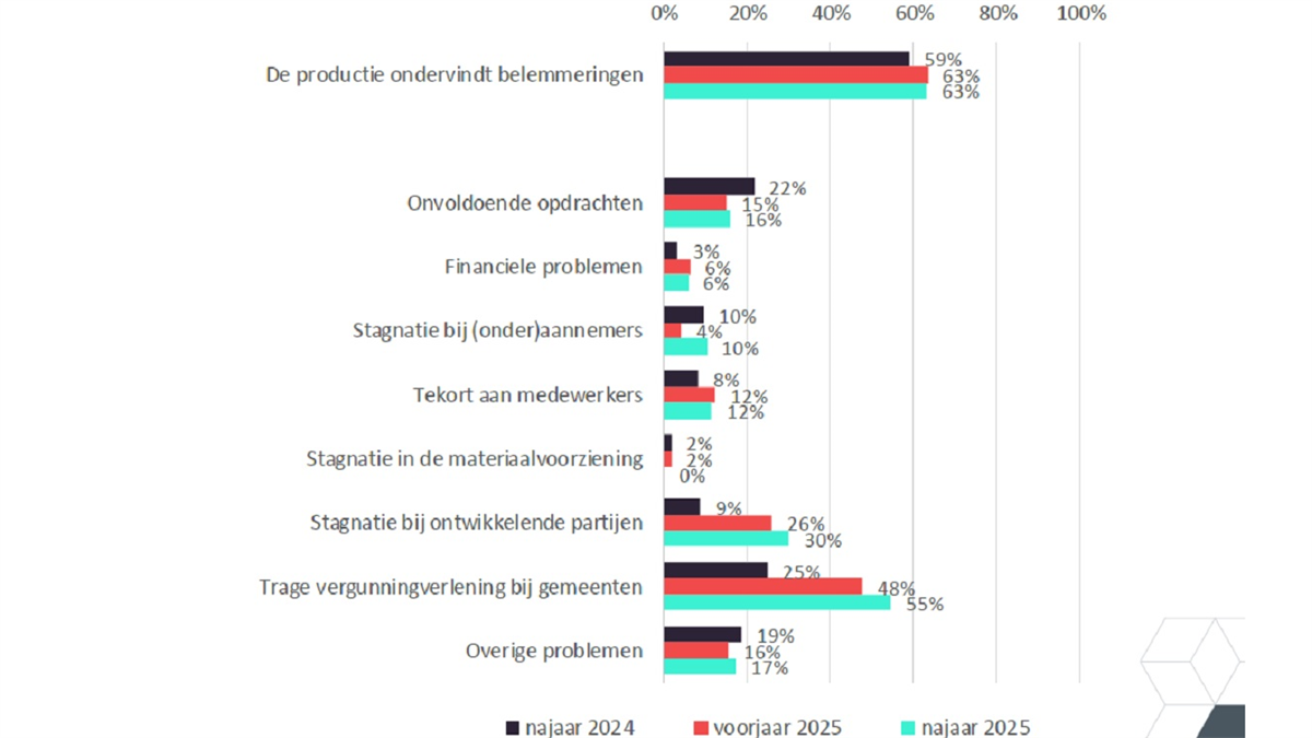 Dat blijkt uit de BNA Conjunctuurmeting najaar 2025, uitgevoerd door Panteia in opdracht van de Koninklijke Bond van Nederlandse Architectenbureaus (BNA). De productieontwikkeling is verdeeld: bij 27% van de bureaus is de productie in de afgelopen drie maanden toegenomen, terwijl bij een even grote groep sprake was van een daling. Tegelijkertijd ervaart bijna twee derde van de bureaus (63%) belemmeringen bij de productie. Dat aandeel is sinds het voorjaar van 2022 vrijwel onveranderd. De trage vergunningverlening door gemeenten wordt het vaakst genoemd als knelpunt, gevolgd door stagnatie bij ontwikkelende partijen.