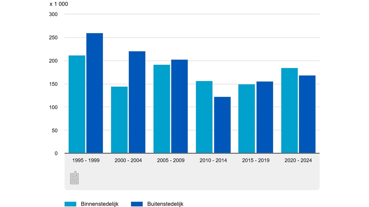 Buitenstedelijk worden vooral meer grote eengezins-koopwoningen gebouwd. Van de bijna 2,2 miljoen nieuwbouwwoningen die van 1995 tot en met 2024 zijn gebouwd, zijn ruim 1,1 miljoen woningen in buitenstedelijk gebied gebouwd en ruim 1,0 miljoen in binnenstedelijk gebied. Binnenstedelijk gebied betekent hier: in gebieden waar al woningen stonden, in stad of dorp. In de periode 1995 tot 2009 werden de meeste nieuwbouwwoningen buitenstedelijk gebouwd, de afgelopen vijftien jaar juist vaker binnenstedelijk.