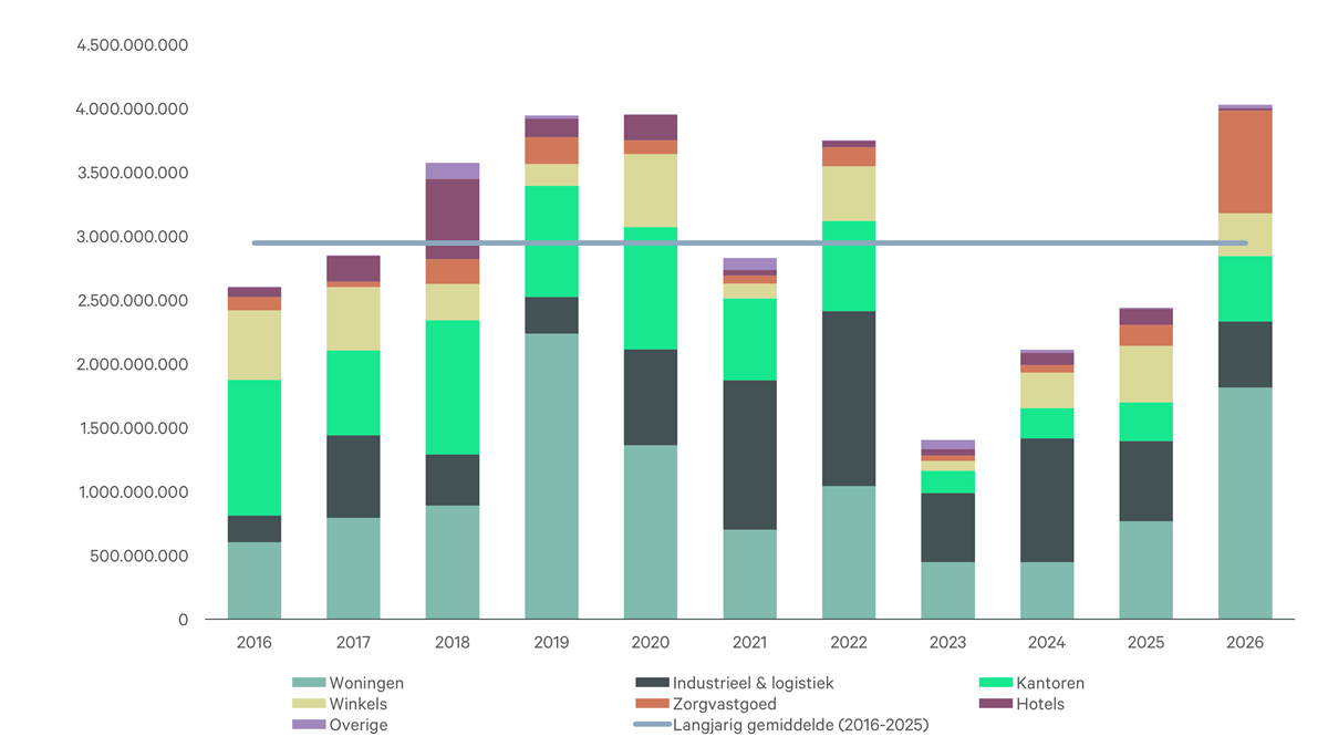 Naast woningen draagt ook zorgvastgoed substantieel bij aan het hoge beleggingsvolume. In zorgvastgoed is circa € 805 mln belegd, grotendeels dankzij twee grote transacties: Aedifica nam 80% van de aandelen van Cofinimmo over en TPG Real Estate kocht twaalf eerstelijnszorgklinieken in Nederland als onderdeel van een bredere pan-Europese transactie.