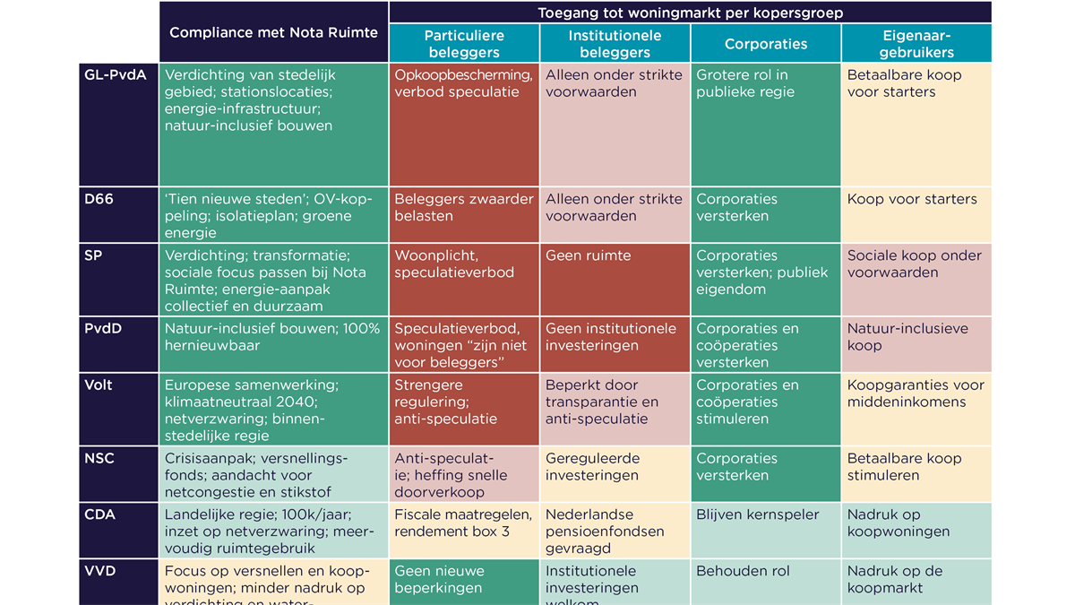 Cushman & Wakefield wil inzicht geven in hoe politieke keuzes de woningmarkt tot 2050 vormgeven en vergelijkt de partijprogramma’s van politieke partijen op ruimtelijke kaders en markttoegang voor beleggers, corporaties en kopers. De politiek beschouwt het woningtekort als een nationale crisis, ze willen allemaal versneld bouwen, maar uit de vergelijking blijkt volgens Cushman & Wakefield dat partijen die aansluiten bij de Nota Ruimte vaak beperkingen opleggen aan investeerders. Andersom geldt dat marktvriendelijke partijen de ruimtelijke discipline loslaten.