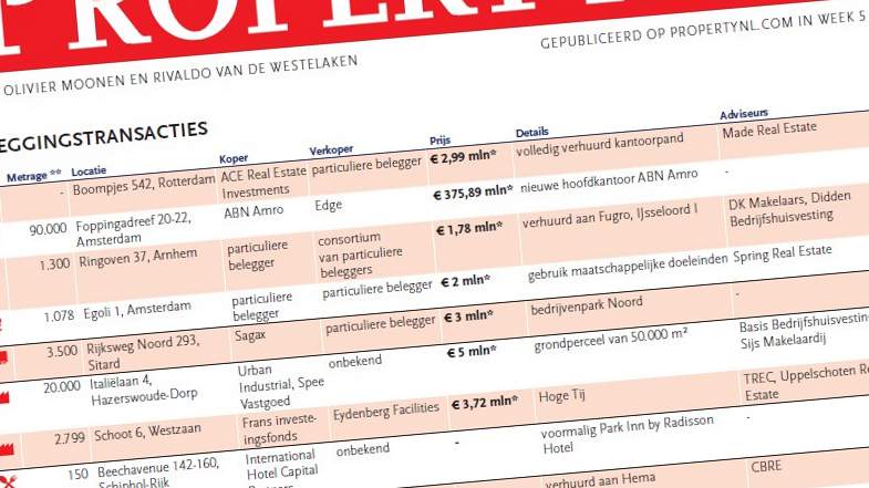 In het PropertyNL-overzicht met transactiedata van week 5 staat onder meer de bovengenoemde transactie. Het wekelijkse overzicht met grotere transacties vermeldt zowel beleggingstransacties als gebruikstransacties van commercieel vastgoed. Dit overzicht wordt ook opgenomen in PropertyNL Magazine.