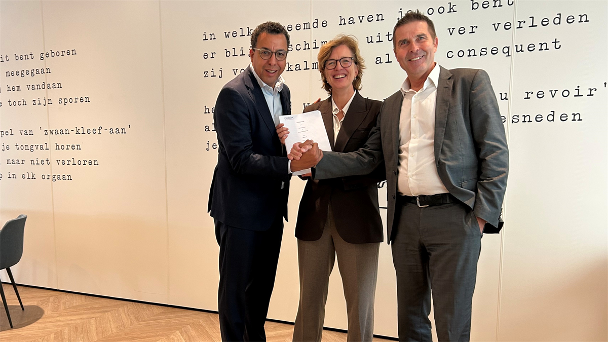 Foto: bestuurders van Haag Wonen, Anne Margreet Kremer en Mohamed Baba, ondertekenden met Peter van Heeswijk van WoonInvest de overeenkomst.