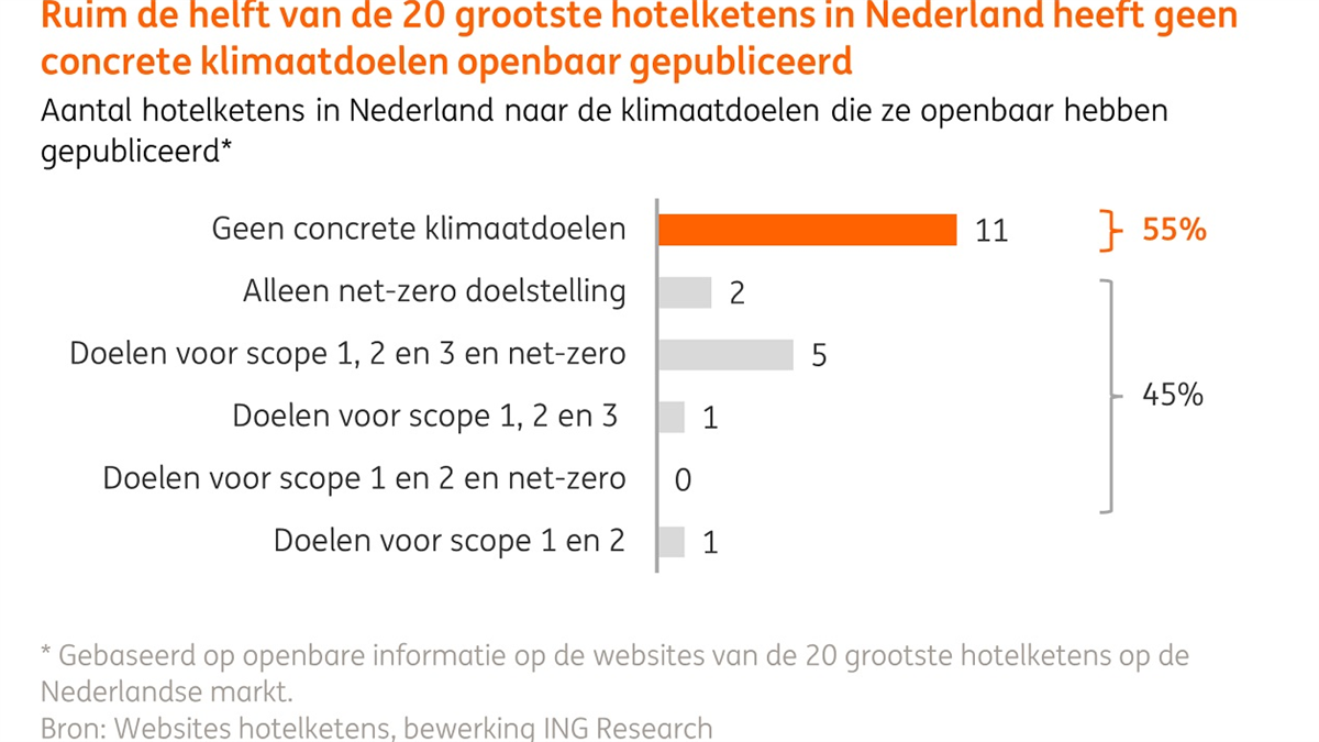 Van de twintig grootste hotelketens die actief zijn op de Nederlandse markt, heeft meer dan de helft van de hotelketens geen concrete klimaatdoelen openbaar gepubliceerd. Sommige hotelketens hebben niet meer dan een algemene MVO-verklaring op hun website staan. Bovendien zijn veel duurzaamheidsrapporten van hotelketens zeer summier, ook die van enkele grote internationale ketens, meldt ING Research.