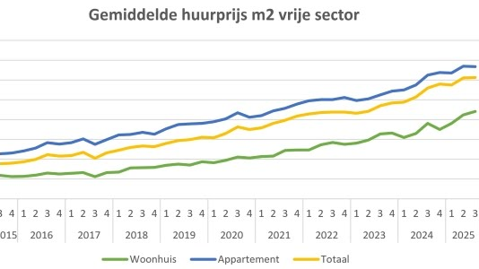 Ten opzichte van vorig jaar is de vrije sector opnieuw gekrompen, mede door invoering van het gereguleerde middensegment. ‘Hierdoor vinden steeds minder woningzoekenden in de vrije sector een woning. Tegelijk stijgen de prijzen van nieuwe verhuurde woningen stevig door’, aldus beide organisaties. De kale huurprijs in de vrije sector lag in het derde kwartaal van 2025 op € 18,26 per vierkante meter, 6,2% hoger dan in hetzelfde kwartaal vorig jaar.