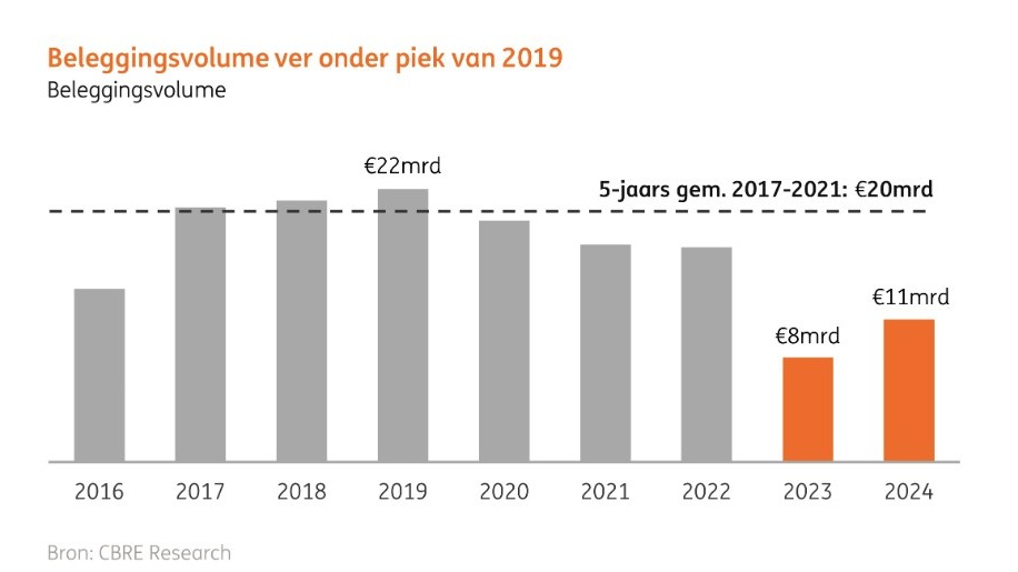Het beleggingsvolume blijft volgend jaar waarschijnlijk ver onder de laatste grote piek van 2019 steken. Wel profiteren beleggers, aldus ING Research, van de verlaging van de overdrachtsbelasting. Dat zal tijdelijk zorgen voor meer woningtransacties tussen beleggers onderling. Particuliere beleggers blijven oudere woningen opkopen die institutionele beleggers aan het einde van hun investeringsperiode van de hand doen, met als doel deze te verkopen als de zittende huurder vertrekt.