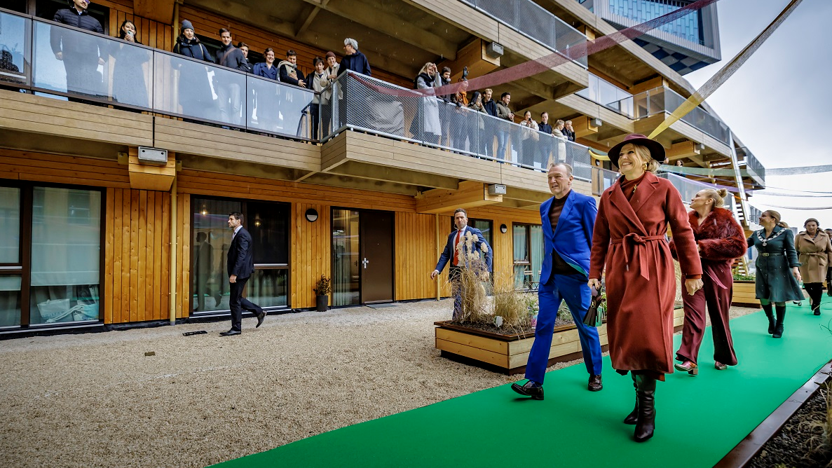 Koningin Máxima heeft dinsdag op de Lloydpier in de Rotterdamse wijk Delfshaven het circulaire houten woongebouw Sawa geopend.