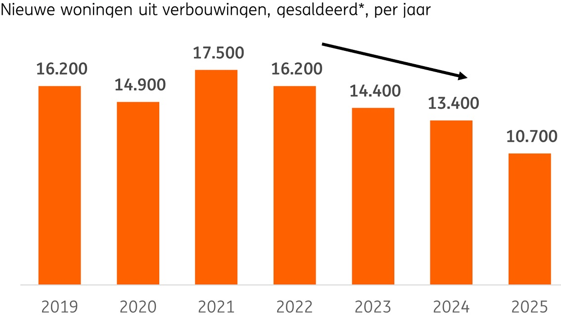 Het aantal nieuwe woningen uit transformaties, optoppingen en splitsingen daalde in vier jaar tijd van 17.500 naar 10.700 op jaarbasis, meldt ING in haar jongste woningmarktrapport.