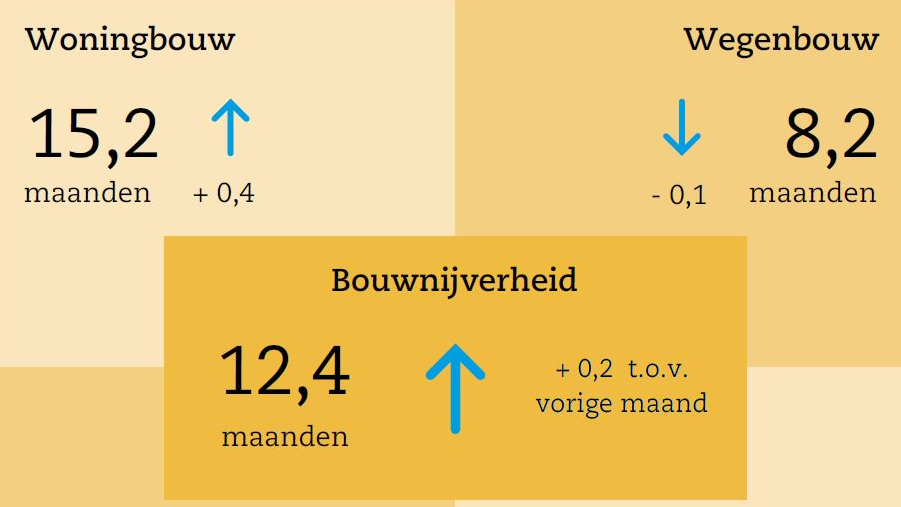 In de woningbouw nam de orderportefeuille met vier tiende maand toe en kwam uit op 15,2 maanden en in de utiliteitsbouw daalde de gemiddelde werkvoorraad licht met 0,1 maand tot 12,0 maanden. In de grond-, water- en wegenbouw stegen de orderportefeuilles met 0,1 maand tot 9,9 maanden werk.