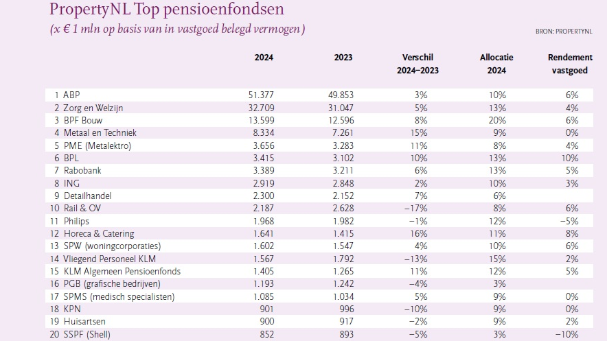 Volgens cijfers van DNB hadden pensioenfondsen eind 2024 voor € 160,6 mrd aan vastgoedbeleggingen op de balans staan. Bij de fondsen stond het rendement in 2023 overwegend in de min. In 2024 geldt dat alleen nog voor de pensioenfondsen van Shell en Philips, die beide een lichte krimp in de portefeuille noteren.