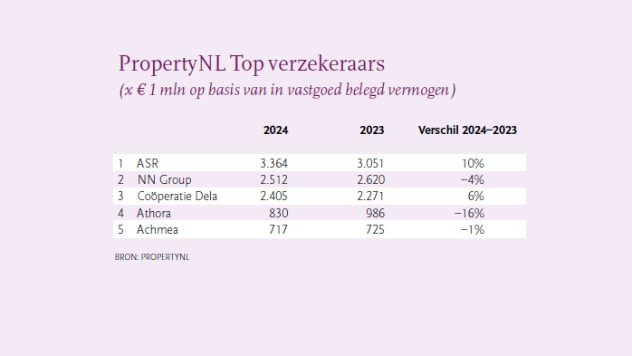 Van verzekeraars is bij DNB alleen bekend wat zij in directe vastgoedbeleggingen hebben gestoken. Dat was eind 2024 € 4,4 mrd. Veruit de grootste vastgoedportefeuille is in handen van het inmiddels door ASR overgenomen Aegon Leven: die is ruim € 2 mrd groot.