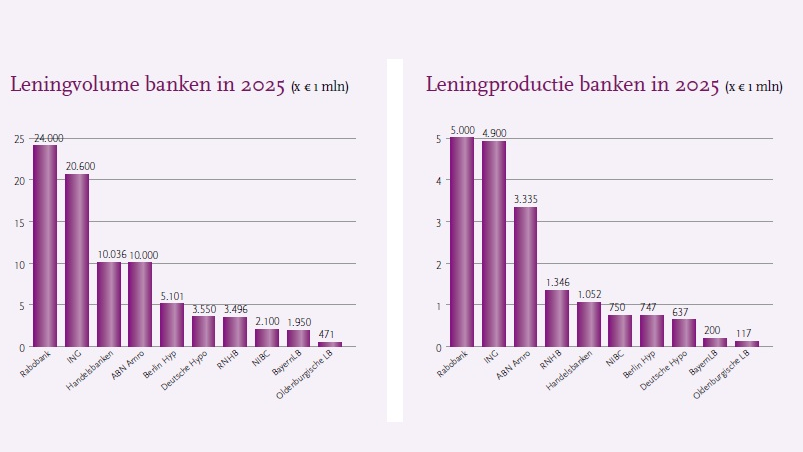 Het leningvolume van de vastgoedfinanciers is met € 3 mrd gestegen tot € 81 mrd in 2025. Opvallend was de daling in leningproductie van 18% bij marktleider Rabobank. Daarentegen een verdubbeling van de productie bij ABN Amro. Ook opvallend: veel vacatures in de vastgoedtop van grootbanken. De functie van vastgoedkoning of vastgoedkoningin is kennelijk niet langer het meest geliefd.