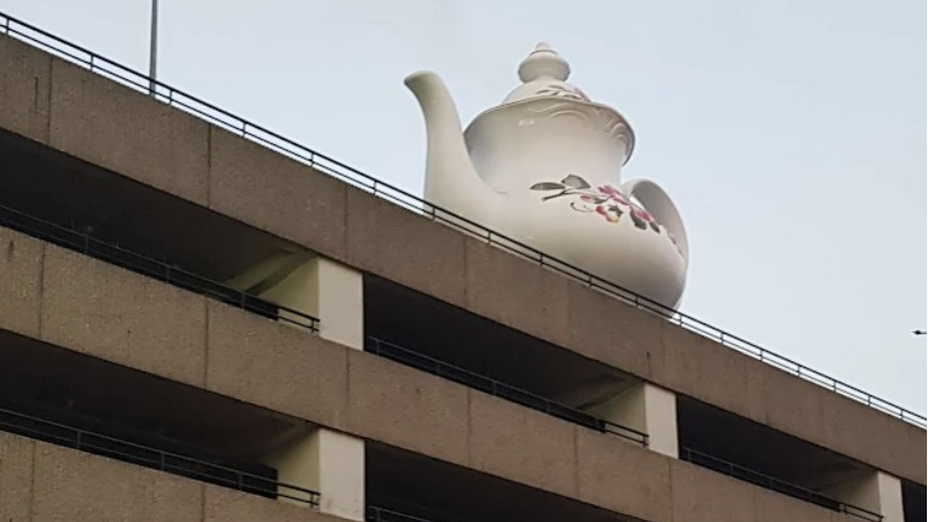 De Celestial Teapot, een 3.500 kilo zwaar kunstwerk van Lily van der Stokker, zou op de nieuwbouw moeten blijven staan.