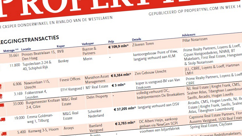 In het PropertyNL-overzicht met transactiedata van week 14 staan onder meer de bovengenoemde transacties. Het wekelijkse overzicht met grotere transacties vermeldt zowel beleggingstransacties als gebruikstransacties van commercieel vastgoed. Dit overzicht wordt ook opgenomen in PropertyNL Magazine.