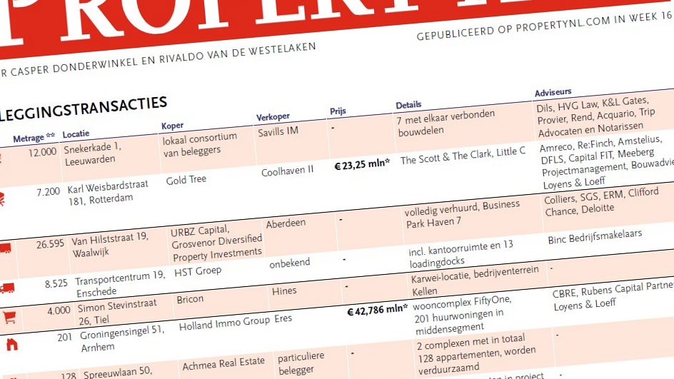 In het PropertyNL-overzicht met transactiedata van week 16 staat onder meer de bovengenoemde transactie. Het wekelijkse overzicht met grotere transacties vermeldt zowel beleggingstransacties als gebruikstransacties van commercieel vastgoed. Dit overzicht wordt ook opgenomen in PropertyNL Magazine.