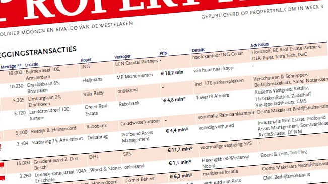 In het PropertyNL-overzicht met transactiedata van week 14 staat onder meer de bovengenoemde transactie. Het wekelijkse overzicht met grotere transacties vermeldt zowel beleggingstransacties als gebruikstransacties van commercieel vastgoed. Dit overzicht wordt ook opgenomen in PropertyNL Magazine.
