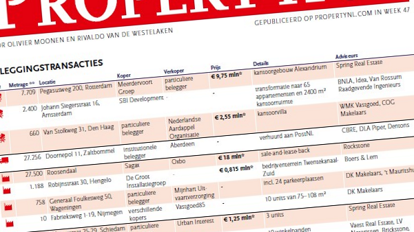 In het PropertyNL-overzicht met transactiedata van week 47 staan onder meer de bovengenoemde transacties. Het wekelijkse overzicht met grotere transacties vermeldt zowel beleggingstransacties als gebruikstransacties van commercieel vastgoed. Dit overzicht wordt ook opgenomen in PropertyNL Magazine.