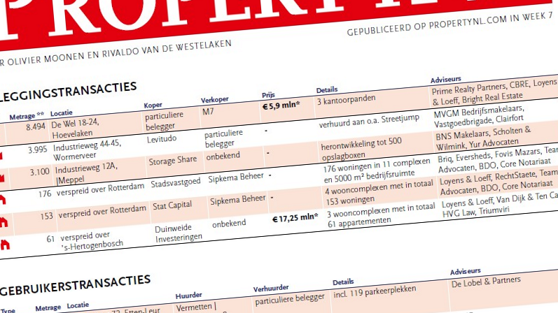 In het PropertyNL-overzicht met transactiedata van week 7 staat onder meer de bovengenoemde transactie. Het wekelijkse overzicht met grotere transacties vermeldt zowel beleggingstransacties als gebruikstransacties van commercieel vastgoed. Dit overzicht wordt ook opgenomen in PropertyNL Magazine.