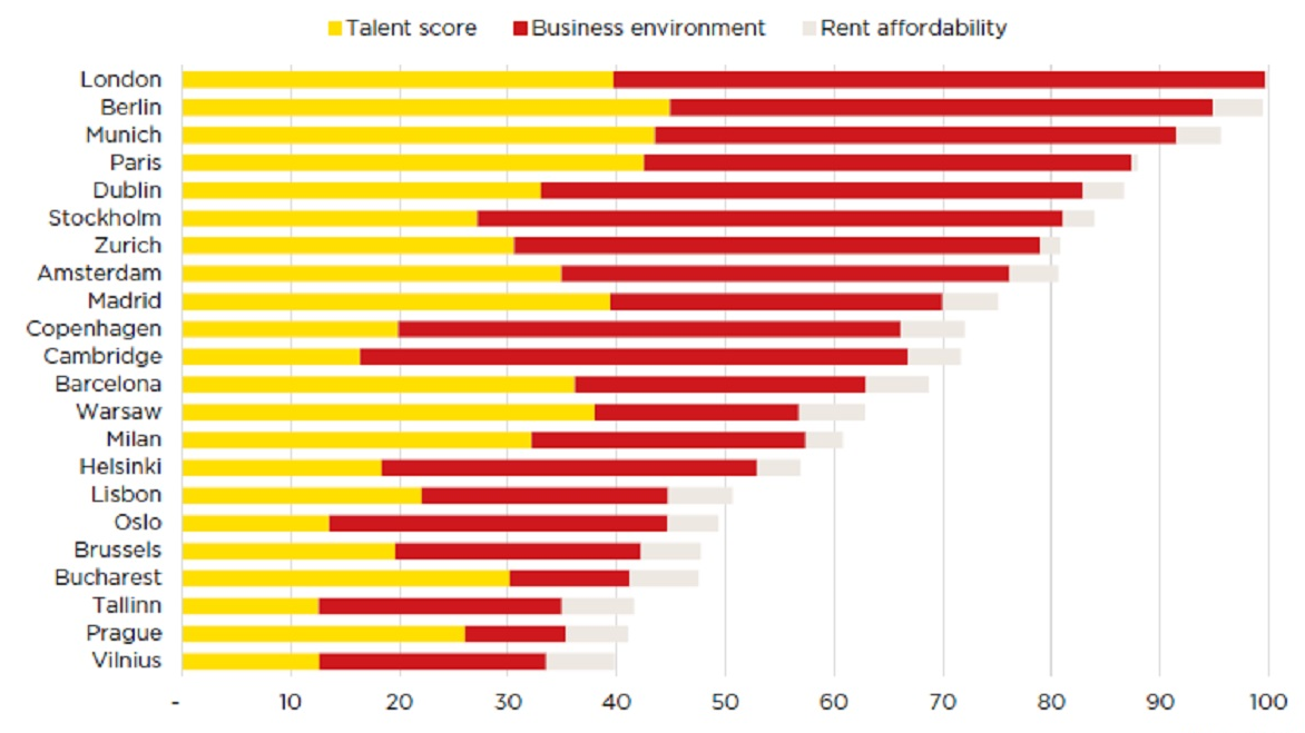 Het onderzoek beoordeelt de kantoorvraag in steden op basis van factoren als techclusters, talentbeschikbaarheid en investeringen. Londen, Berlijn, München, Parijs en Dublin voeren daarbij de lijst aan. Savills ziet dat grote technologiebedrijven fors investeren in het bouwen en trainen van AI-modellen om de race te winnen en industrieën opnieuw vorm te geven. Alleen al in 2025 en 2026 zullen Google, Amazon, Microsoft en Meta naar verwachting $750 miljard uitgeven aan servers, chips en datacenters om hun AI-modellen te ondersteunen.