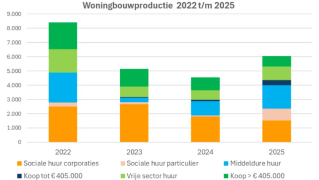 De verdeling over de hoofdcategorieën (sociale huur – middensegment – vrije sector) is in 2025 met 39%-33%-28% in lijn met de ambitie om met name betaalbare woningen toe te voegen. In 2025 bevond het overgrote merendeel van de woningen die in aanbouw zijn genomen (72%), in totaal 4.008 woningen - zich in het betaalbare segment (sociale huur en middensegment).