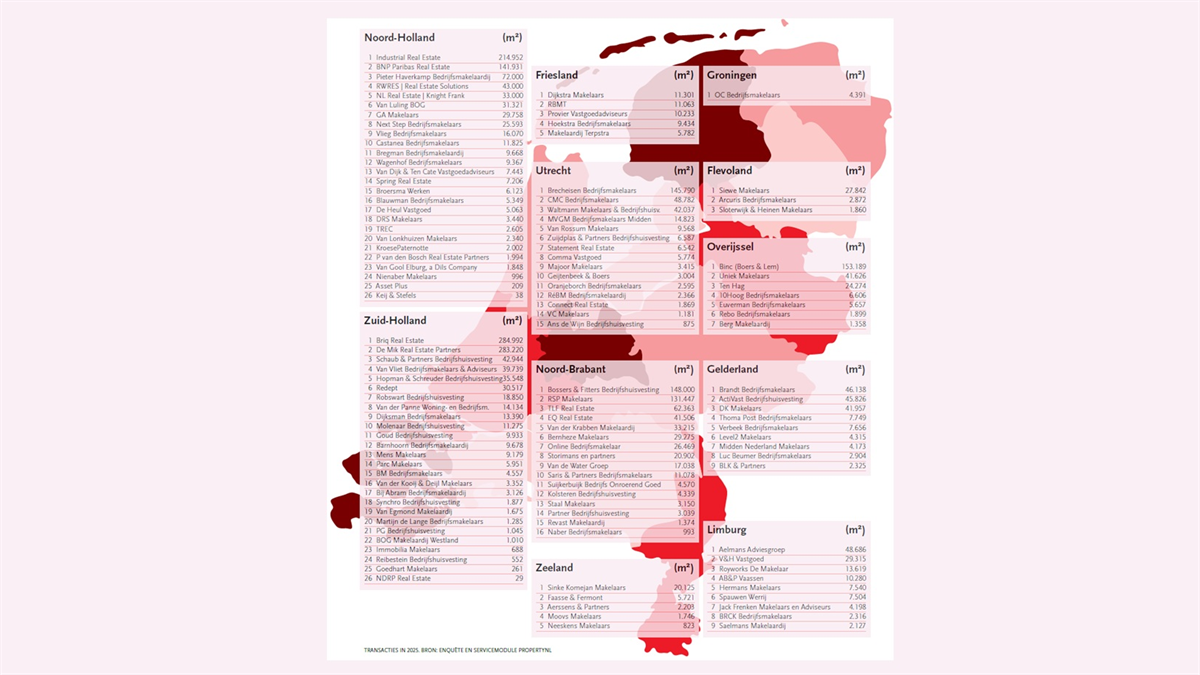 Briq Real Estate heeft er geen last van en neemt de koppositie over van stadgenoot De Mik. De Lobel, voorheen een top 3-speler in bedrijfsruimte, wilde deze keer geen transactietotalen doorgeven. Een sterke groei maakt Binc, het voormalige Boers & Lem, door: de metrage verdubbelt ruim, waardoor het bedrijf uit Enschede het eveneens groeiende Bossers & Fitters van de vierde plek houdt.