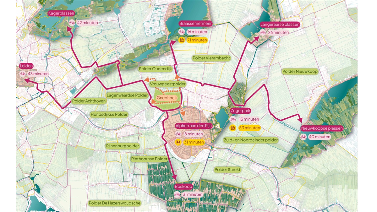De Gnephoek kent een bijzondere voorgeschiedenis. Het gebied werd ooit kortstondig overwogen als baggerdepot voor slib uit de Rotterdamse haven en stond in de jaren ’90 op de radar als potentiële Vinex-locatie, maar werd destijds niet geselecteerd. Desondanks bleef de locatie in beeld bij gemeente Alphen aan den Rijn. Rond 2017–2019 volgde een herverkenning van de Gnephoek als mogelijke locatie voor ontwikkeling aan de stadsrand en groeide de urgentie. De directe aanzet was een praktische bestuurlijke vraag: waar kan nog worden gebouwd? Binnenstedelijke verdichting stokte, terwijl de vraag naar (grondgebonden) woningen groot bleef. Een beoordeling van meerdere stadsrandopties wees de Gnephoek aan als een van de meest kansrijke locaties. Het vervolgtraject leverde een set ambities en randvoorwaarden op die de toon zetten voor de gebiedsontwikkeling. De kern: water- en bodem sturend, waarbij het natuurlijke systeem leidend is voor programma en inrichting. Daarmee groeide de Gnephoek uit tot een voorbeeldcasus voor water- en bodemgestuurde gebiedsontwikkeling in Zuid-Holland.