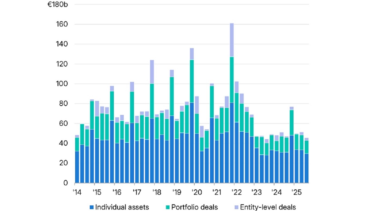 Op Europees niveau blijft het beeld gemengd. In totaal werden in het derde kwartaal voor €45,6 mrd aan vastgoedtransacties afgerond – een daling van 3% ten opzichte van dezelfde periode in 2024. Het aantal deals was het laagste sinds 2013.