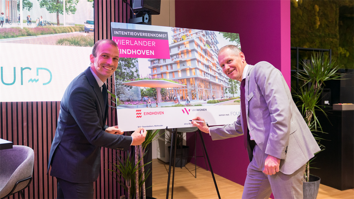 De Eindhovense wethouder Stijn Steenbakkers en Alfred Bolks van gebiedsontwikkelaar VanWonen hebben woensdag op de Provada een intentieovereenkomst getekend voor de ontwikkeling van Vierlander.