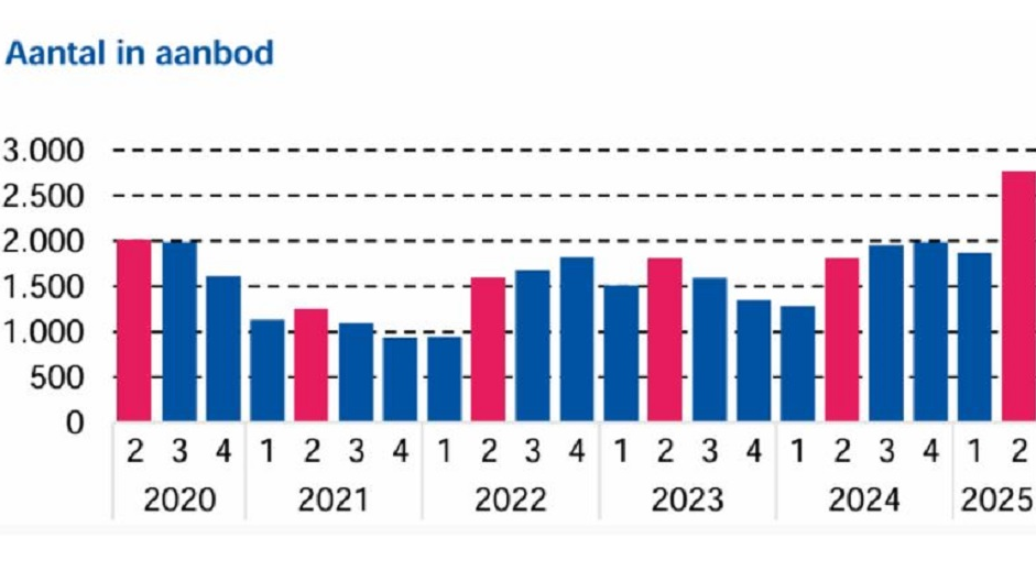 Er stonden aan het einde van het kwartaal 2.763 woningen te koop, een stijging van maar liefst 53% ten opzichte van een jaar eerder. Deze groei is fors hoger dan het landelijk gemiddelde, waar het aanbod met 23% toenam. Vooral het aantal te koop staande appartementen nam toe, met een stijging van 59% ten opzichte van vorig jaar.