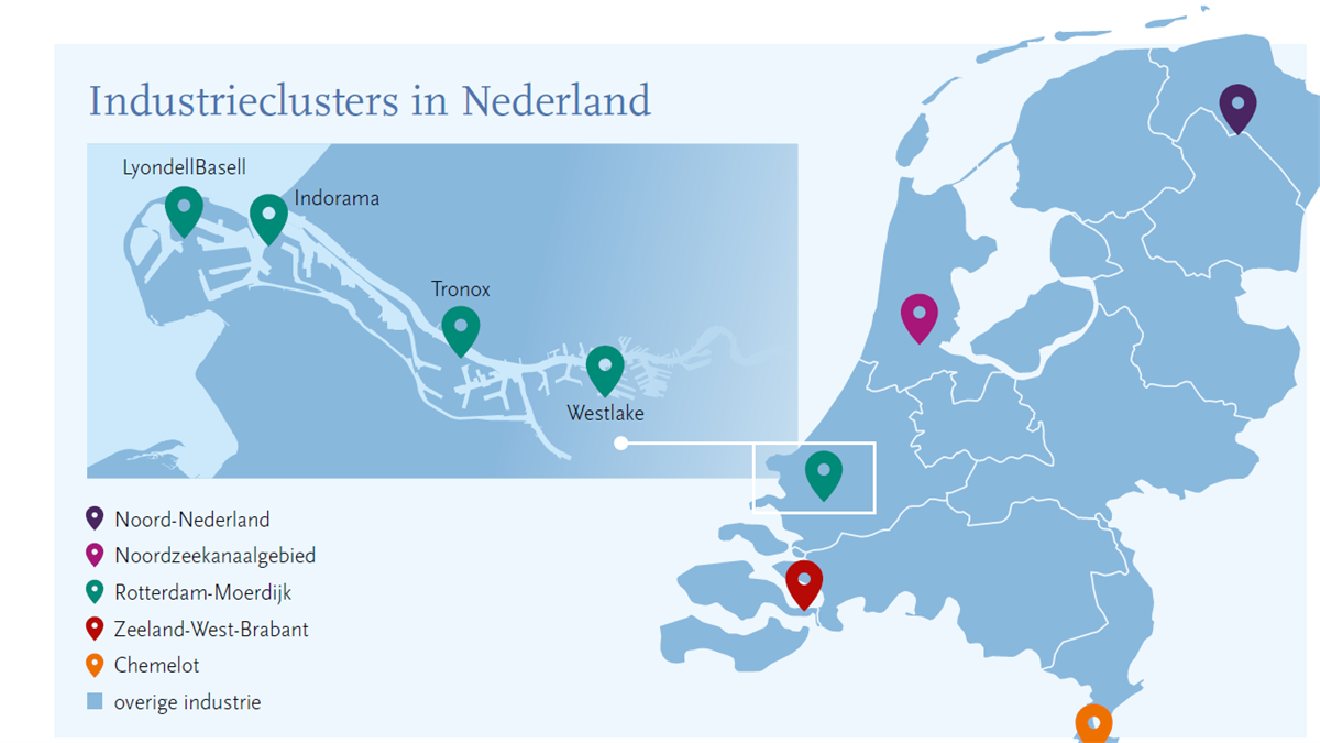 Het chemiecluster rondom Rotterdam, met Dordrecht en Moerdijk erbij, is het grootste van het land. In de top-5 staan verder Chemelot (bij Geleen), cluster Zeeland/West-Brabant, cluster Noord-Nederland en cluster Noordzeekanaal-gebied. Behalve deze geografische begrensde gebieden hanteert de rijksoverheid ook nog een zesde cluster. Dit is verspreid over het land en bestaat uit de voedingsmiddelenindustrie, keramiek, papier- en kartonindustrie en een aantal kleinere industrieën.